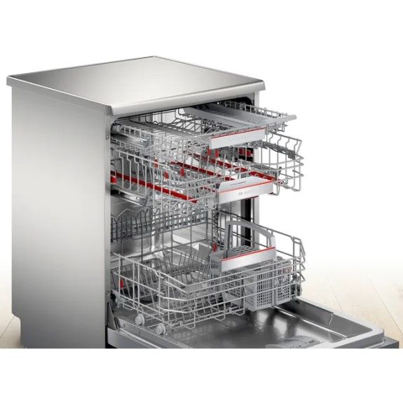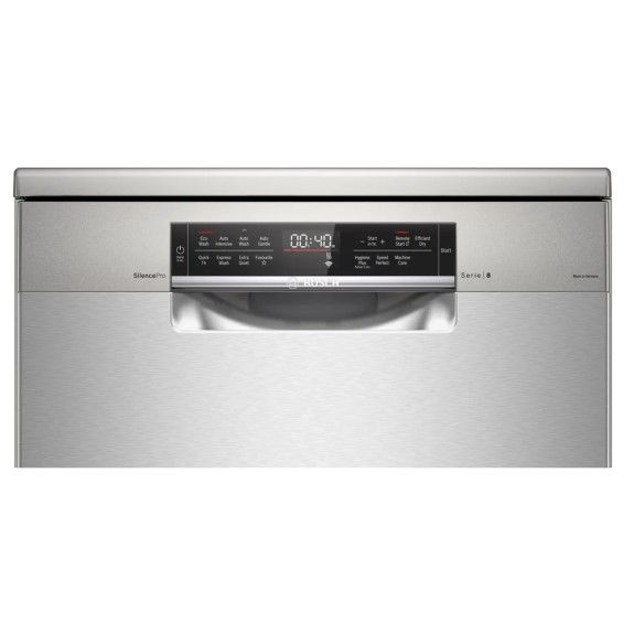 The Bosch 60cm Series 8 Freestanding Dishwasher in stainless steel offers powerful cleaning performance with smart connectivity and thoughtful design, making it a reliable addition to any modern kitchen. With a generous 14 place setting capacity, it easily accommodates family meals and dinner party clean-ups alike. Choose from 8 versatile wash programs and 5 customisable options to suit everything from delicate glassware to heavily soiled pots and pans. The HomeConnect feature allows you to control and monitor your dishwasher remotely, adding convenience to your daily routine, while SpeedonDemand lets you reduce cycle times when you're in a hurry. AutoDoor Open technology automatically opens the door at the end of the cycle to improve drying efficiency and reduce energy use. For peace of mind, AquaStop Plus provides 24/7 anti-flood protection, safeguarding your kitchen from unexpected leaks. With its sleek stainless steel finish and premium features, the Bosch Series 8 dishwasher combines style, capacity and smart functionality for everyday ease.