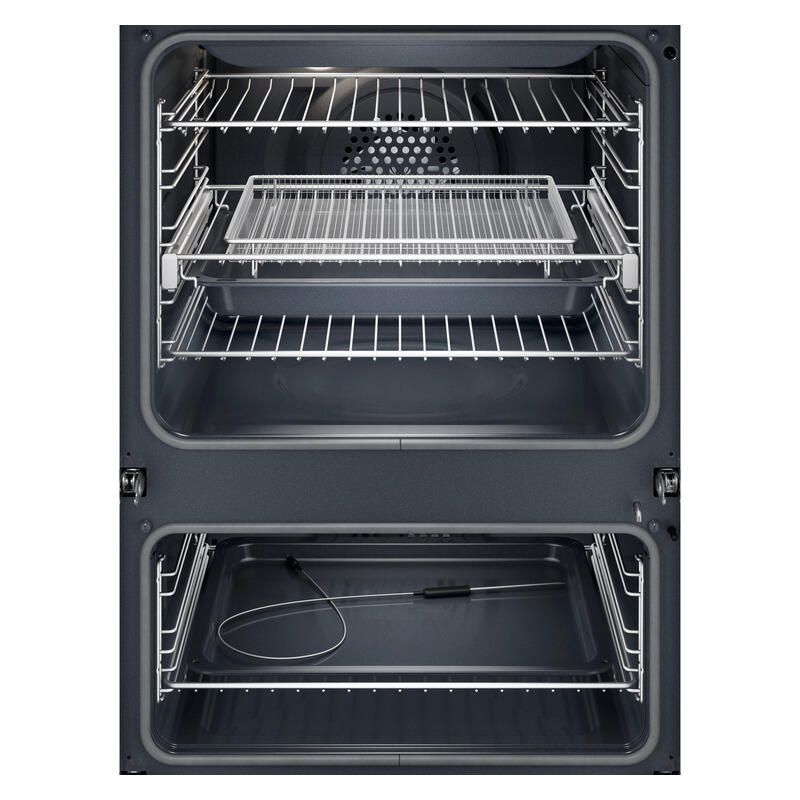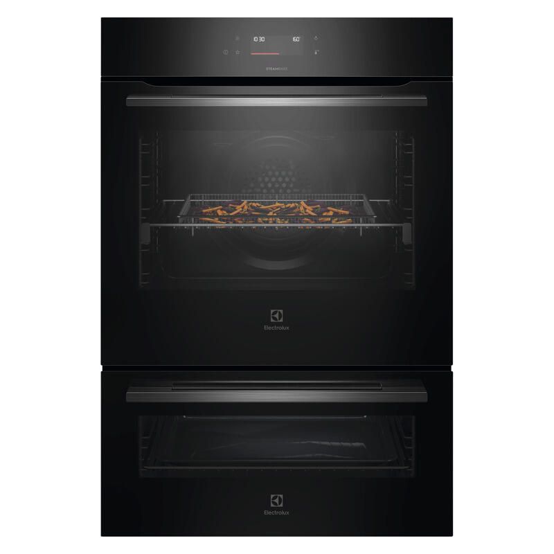 The Electrolux Series 600 Steam Bake 24 Function Pyrolytic Duo Oven offers a premium cooking experience with the flexibility of a dual oven in one streamlined appliance. SteamBake technology enhances results by introducing moisture, ideal for baking and roasting with improved texture and flavour. The AirFryPlus function makes it easy to enjoy crispy dishes with less oil, while the food probe ensures precise cooking by tracking internal temperatures. Featuring 46 assisted cooking programs, it supports a wide variety of recipes with consistent outcomes. Its pyrolytic self cleaning function reduces cleaning time by turning grease and residue into ash, making it a convenient and efficient addition to any modern kitchen.