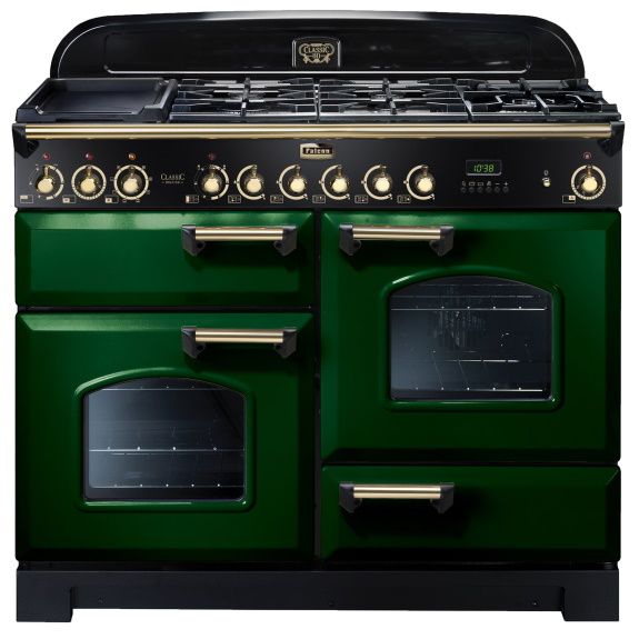 Elevate your kitchen aesthetic with the Falcon Classic Deluxe 110cm Dual Fuel Cooker in Green and Brass. This premium cooker combines timeless design with modern features for exceptional cooking performance. Featuring a multifunction oven, 5 gas burners including a multi-ring wok burner, and two ceramic burners, this cooker offers versatility for all your culinary creations. The left-hand programmable oven and programmable clock ensure precise cooking control, while the separate storage drawer provides added convenience. With features like sit-on griddle plate, wok cradle, and child lock on oven controls, cooking becomes a pleasure. Experience culinary excellence with the Falcon Classic Deluxe 110cm Dual Fuel Cooker, where style meets functionality in every dish.