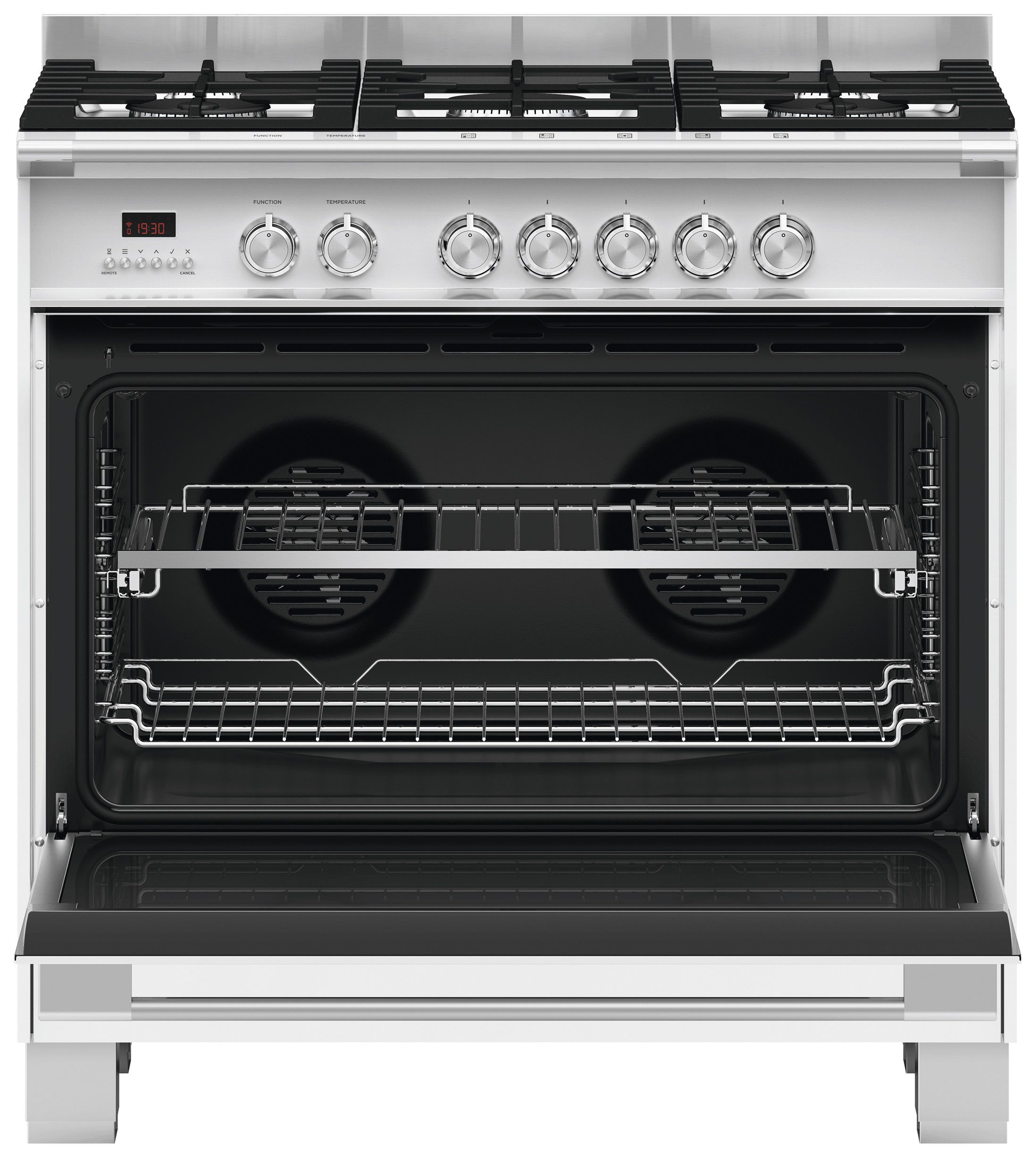 The Fisher & Paykel 90cm Dual Fuel Freestanding Cooker is a premium appliance that is perfect for modern kitchens. With its generous 118L oven capacity and 9 different cooking functions, including Bake, Fan Bake, Fan Forced, Grill, and more, this cooker is designed to handle all your cooking needs. The gas cooktop features 5 burners, including a dual-ring wok burner and a simmer burner, providing precise cooking capabilities, and the electronic ignition and flame failure safety device ensure safe and reliable operation. The enamel interior and removable oven door make cleaning and maintenance a breeze, and the sleek white glass exterior and stainless steel finish give this cooker a stylish appearance. The freestanding design means that you can place it anywhere in your kitchen without the need for built-in installation, while the oven also includes features such as a digital clock and timer, internal light, and cool-touch triple-glazed door for added convenience and safety.