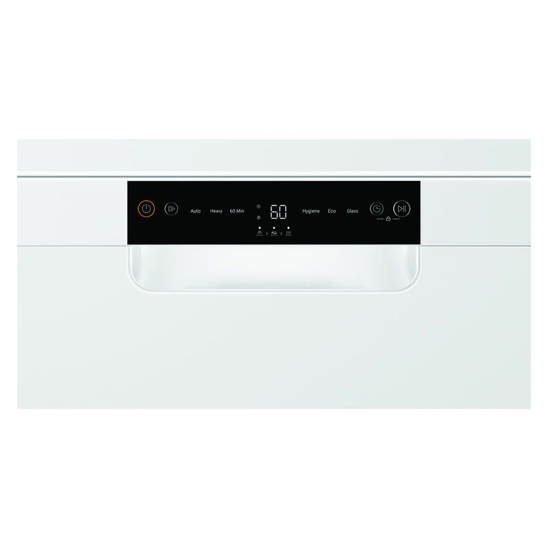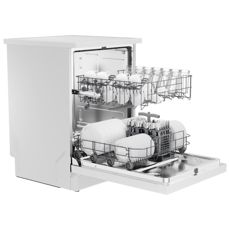 The Haier 13 Place Setting Freestanding Dishwasher in white, part of the reliable 300 Series, is built to make everyday dishwashing simpler and more efficient. With six versatile wash programs to suit everything from lightly soiled glassware to heavily used pots and pans, it offers flexibility for busy households. The spacious interior comfortably holds up to 13 place settings, and the adjustable basket and two foldable cup racks allow for easy loading of awkward or oversized items. Soft-touch buttons and a clear LED display make selecting your preferred cycle quick and straightforward. Behind the scenes, triple filtration technology ensures a thorough clean by capturing food particles and preventing re-deposits during the wash. Rated 4.5 stars for water efficiency and 3 stars for energy, it?s a practical choice for those looking to reduce utility costs without sacrificing performance. With its clean white finish and thoughtful design, this dishwasher delivers convenience, efficiency and reliability with every load.