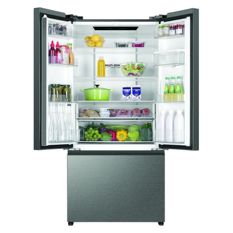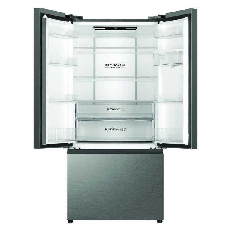 The Haier 509L French Door Refrigerator from the 500 Series combines refined design with everyday practicality, making it a standout choice for households that value both style and performance. Offering a spacious 509-litre capacity and a well-considered 70:30 fridge-to-freezer ratio, it provides easy access to fresh food while keeping frozen items neatly organised below. Thoughtfully engineered to suit standard Australian kitchen cavities, this French door model includes a non-plumbed chilled water dispenser that?s simple to refill?perfect for refreshing hydration without the need for complex installation. Inside, Haier?s Humidity Zone drawer helps maintain optimal moisture levels to keep fruit and veg fresher for longer, while the Multi-Zone Air system ensures consistent cooling throughout every corner of the fridge. Designed with energy efficiency in mind, the inverter motor adapts to usage patterns, delivering quiet performance and reduced power consumption. With adjustable shelving, bright LED lighting and a sleek, modern finish, this fridge offers a seamless blend of convenience, efficiency and elegant design for the heart of your home.