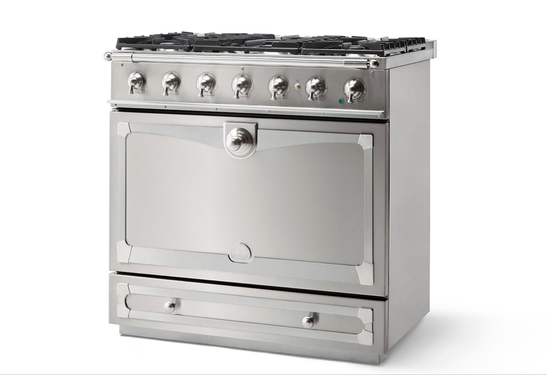 LaCornue Albertine 90cm Dual Fuel Cooker – Brushed Stainless Steel with Brushed Nickel & Stainless Steel Trim