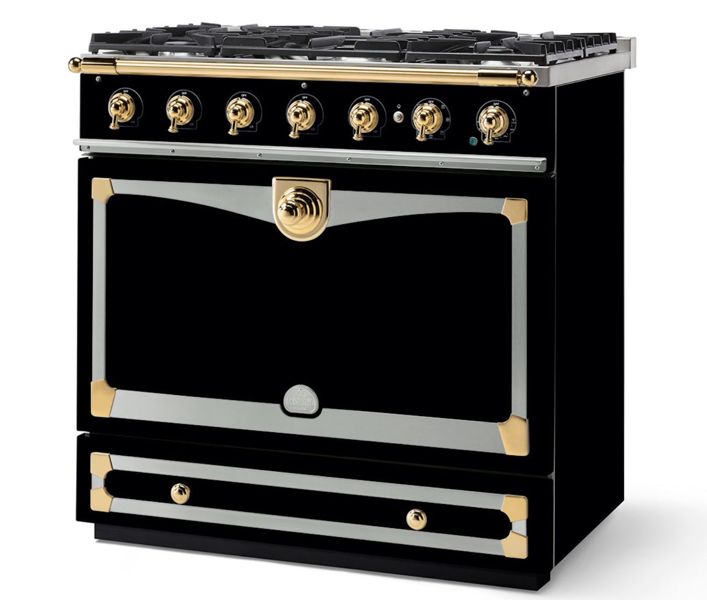 LaCornue Albertine 90cm Dual Fuel Cooker – Shiny Black with Polished Brass & Stainless Steel Trim