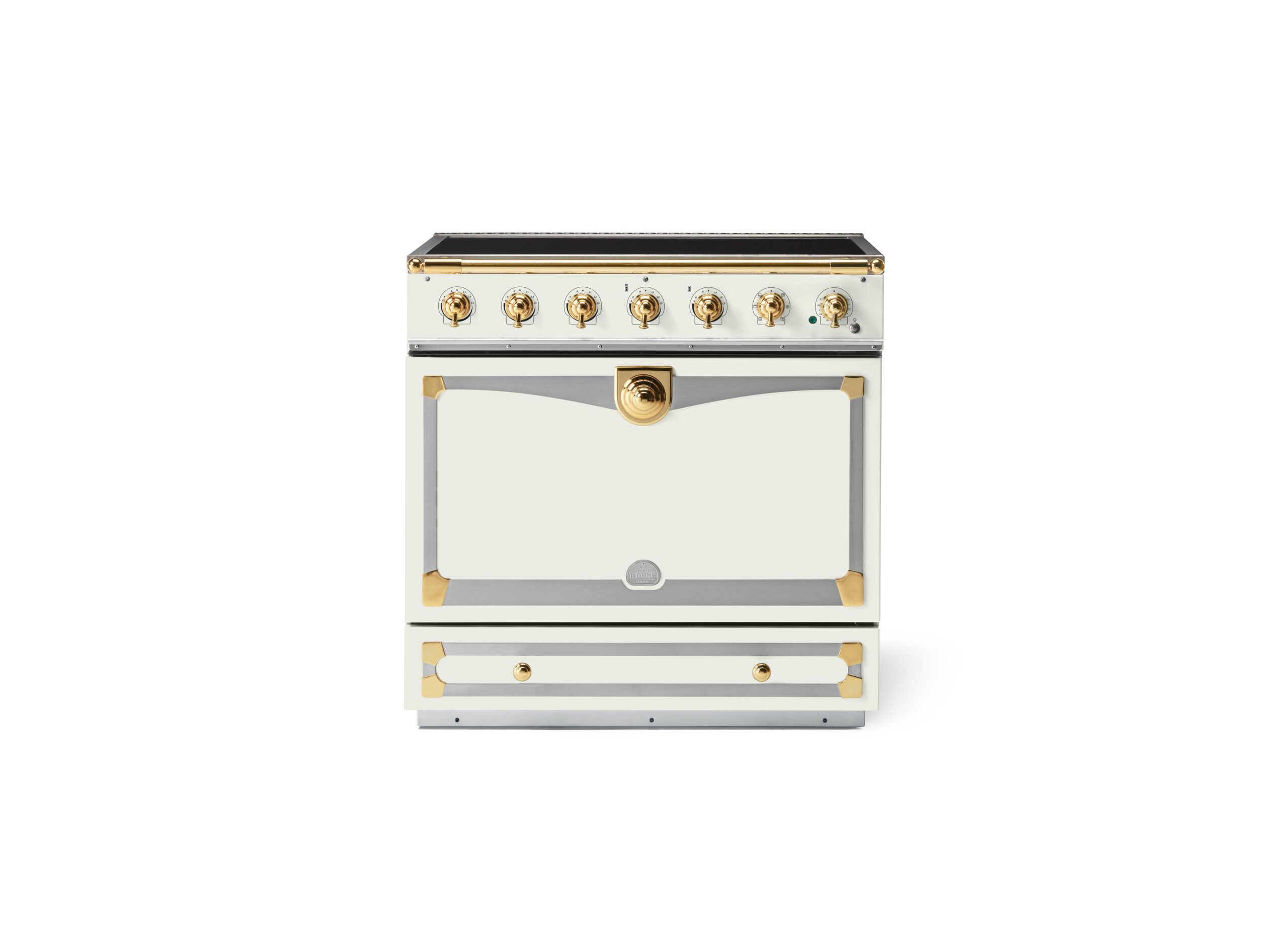 LaCornue Albertine 90cm Induction Cooker – Pure White with Polished Brass & Stainless Steel Trim