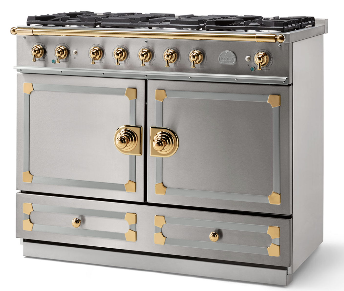 LaCornue Cornufé 110cm Dual Fuel Cooker – Brushed Stainless Steel with Polished Brass & Stainless Steel Trim