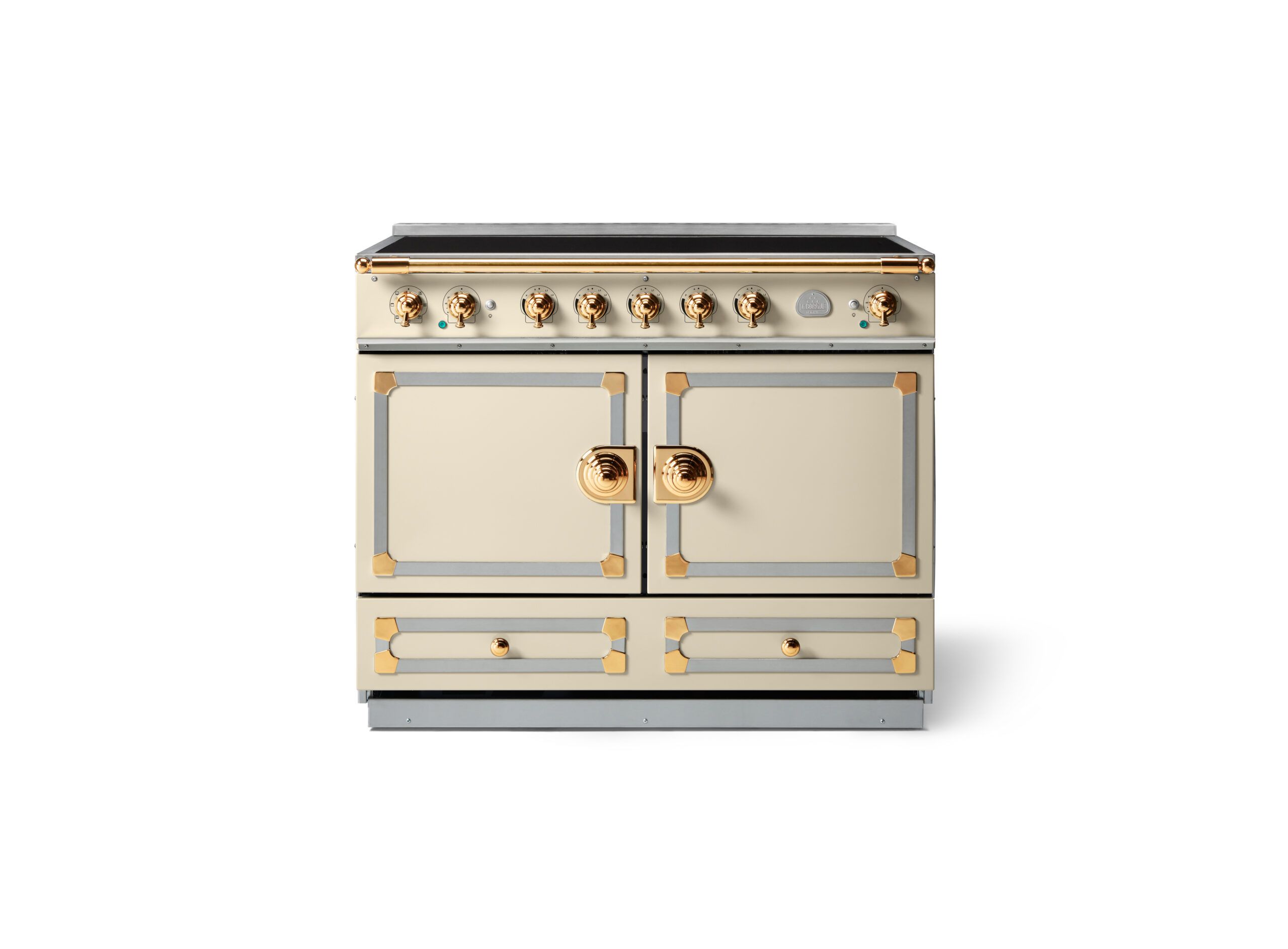 LaCornue Cornufé 110cm Induction Cooker – Morning Dew with Polished Brass & Stainless Steel Trim