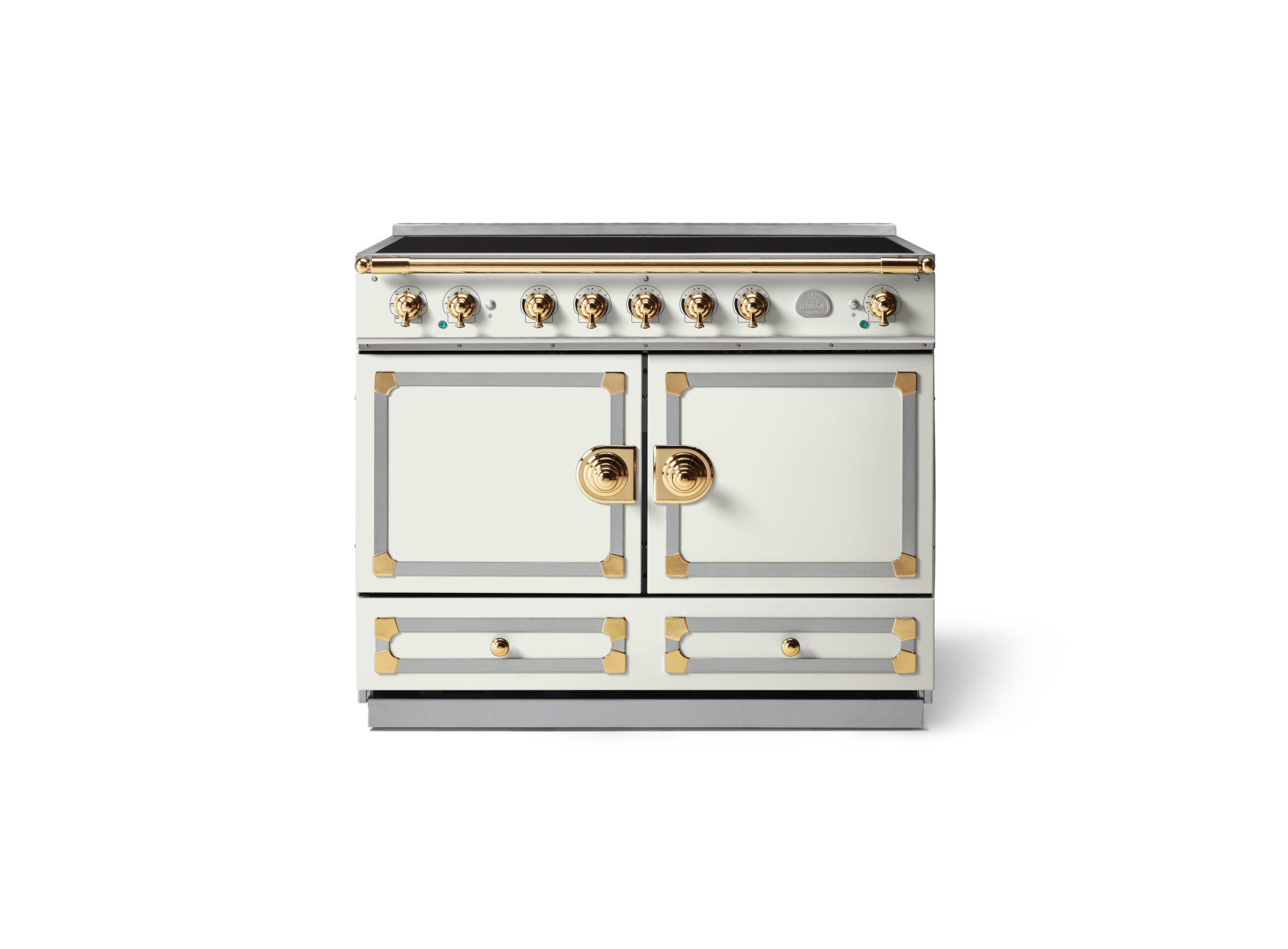 LaCornue Cornufé 110cm Induction Cooker – Pure White with Polished Brass & Stainless Steel Trim