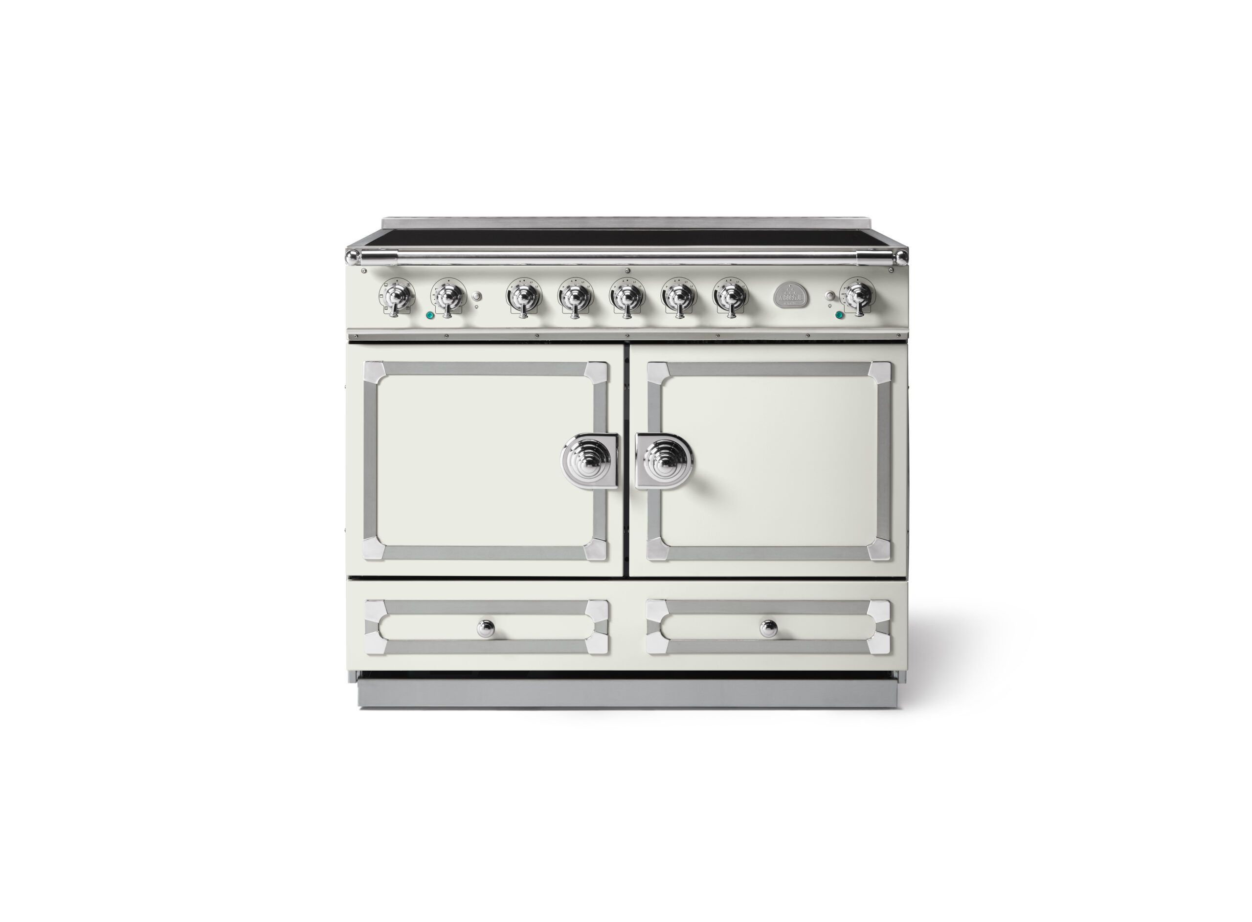 LaCornue Cornufé 110cm Induction Cooker – Pure White with Polished Chrome & Stainless Steel Trim