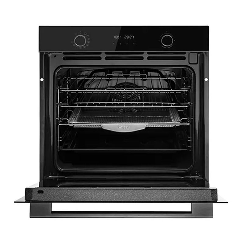 Enhance your culinary space with the sleek Omega 60cm Built-In Oven featuring Airfry technology, finished in elegant Midnight black. This spacious oven offers an impressive 85L gross capacity, perfect for all your baking and roasting adventures. The stylish black tinted glass door with triple glazing and a removable feature, paired with an aluminium handle, adds a touch of sophistication and practicality to your kitchen. Precision is at your fingertips with machined steel knobs and a user-friendly touch control timer. With 5 shelving positions, chrome wire racks, an enamelled baking tray, a grill, and an airfry insert, this oven promises versatile cooking options. It operates efficiently within a temperature range of 60-250?C, catering to a wide array of dishes. The enamel-coated cavity ensures easy cleaning, while the 15 Amp hardwired installation is designed to fit seamlessly into underbench or tower kitchen configurations.