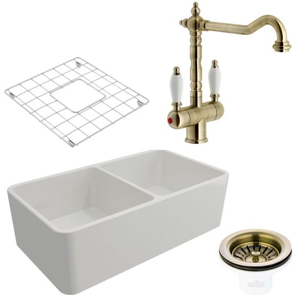 This gorgeous package by Turner Hastings comes with a Novi 85 x 46 Fine Fireclay Gloss White Butler Sink, Antique Brass Basket Waste, Antique Brass Frances Twin Mixer as well as two Stainless Steel Protector Grids. The sink is made in Europe, using high quality fireclay and durable glazing. It is thermal shock resistant and heat proof. Novi is resistant to stains, scratches and chemicals which makes it easier when it comes to cleaning or very hot temperatures. The product is reversable meaning there are two choices during the installation of either ribbed or flat surface side.
