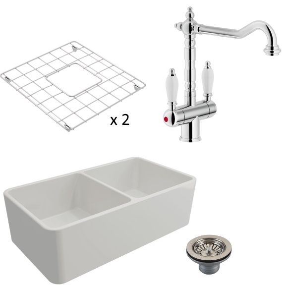 Turner Hastings Novi 85×46 Fireclay Sink + Protector Grids + Basket Waste + Frances Twin Mixer