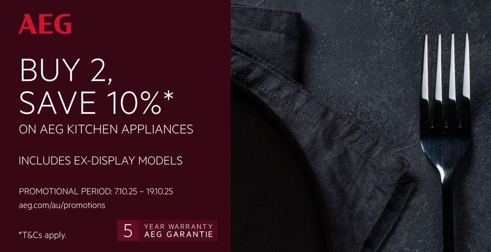 Save on your kitchen upgrade—buy 2 eligible AEG appliances and get 5% off, or buy 3 or more to save 10%. Offer valid on select models from 20 October to 1 December 2025, while stocks last.