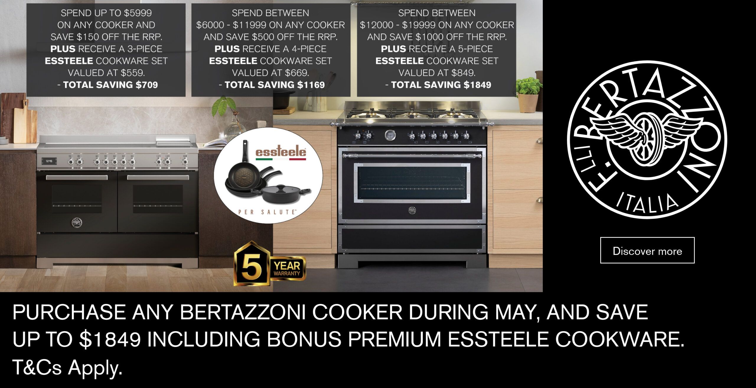 Purchase any eligible Bertazzoni cooker and save up to $1,849, including a premium Essteele cookware set. Total savings vary by spend tier. Offer applies to select models only. Terms and conditions apply.