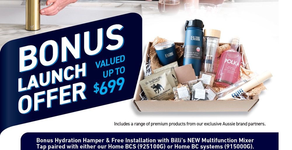 Get a bonus hydration hamper and free installation—valued up to $699—when you buy Billi’s new multifunction mixer. Includes premium products from select Aussie brand partners. Offer applies to eligible purchases only.