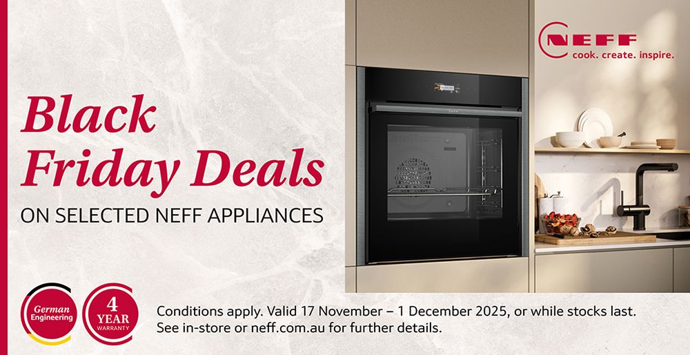 Shop selected Black Friday deals on Neff Appliances including Ovens, Cooktops and Dishwashers. Enjoy up to $500 off eligible models, including Slide&Hide ovens and induction cooktops. While Stocks Last.