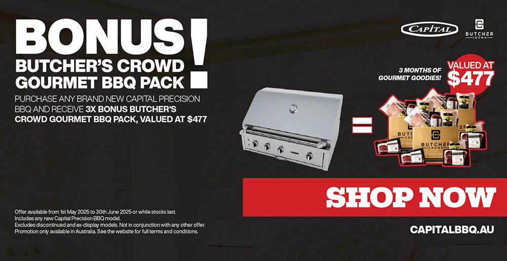 Receive a Bonus Butchers Crowed Gormet BBQ pack valued up to $477 with the purchase of select BBQs.