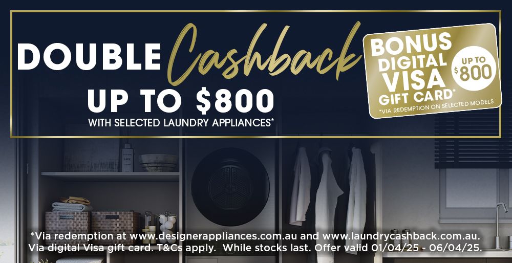 Purchase select Laundry Appliances during the promotional period to receive up to $800 Cashback via a Visa Gift Card, via redemption