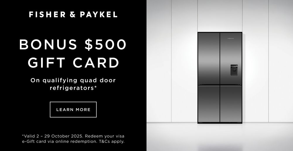 Purchase a qualifying Fisher & Paykel Quad Door Refrigerator and be eligible to receive a $500 bonus Visa e-Gift Card* via Redemption.