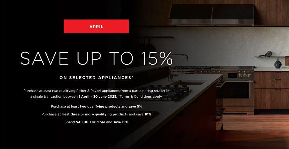Save when you buy multiple qualifying Fisher & Paykel appliances! Purchase two for 5% off, three or more for 10% off, or spend $40,000+ to unlock 15% savings. *Terms & Conditions apply. Qualifying categories include Built-in Ovens, Companion products, Freestanding Cookers, Cooktops, Integrated Refrigerators (excluding freestanding fridges), Column Refrigerators and Freezers, Wine Cabinets, CoolDrawer Multi-temperature Drawers, All Dishwashers including DishDrawer Dishwashers (excluding Freestanding Dishwashers), Series 11 Washing Machines, Dryers and Fabric Care Cabinets, and All DSC Grills & Carts.