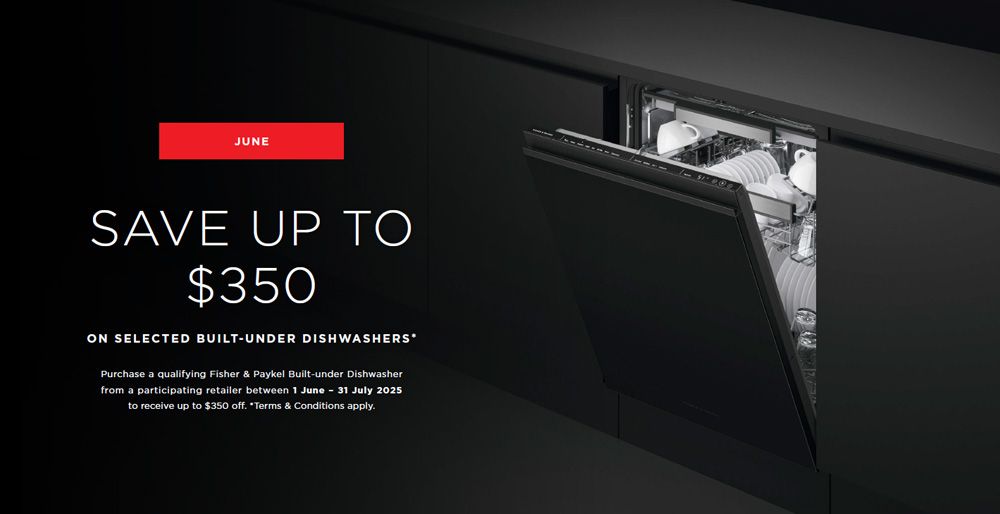 Get up to $350 off when you purchase a select Fisher & Paykel Built-under Dishwasher. Discount available on eligible models only. *Terms & Conditions apply.