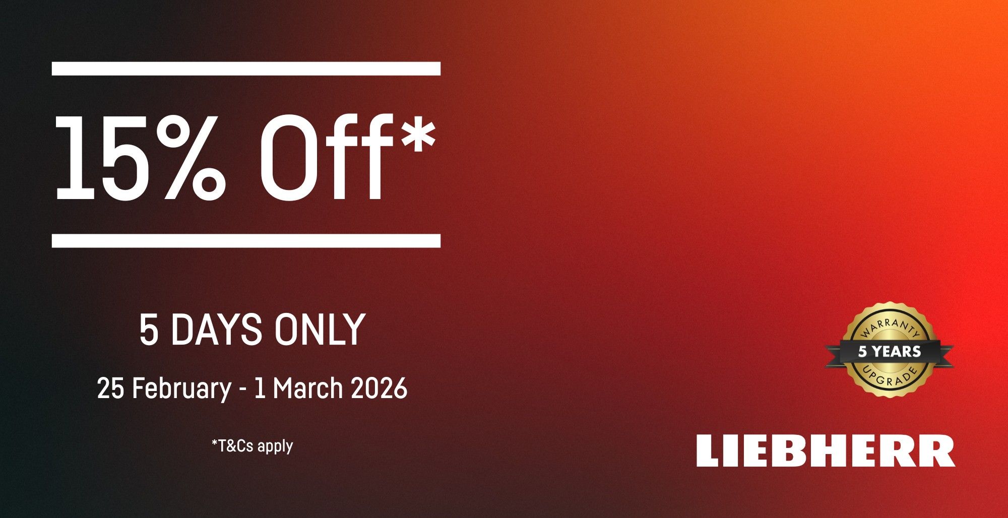 Save 15% off selected premium Liebherr appliances purchased between 25 February–1 March 2026. Excludes specified models, accessories, clearance stock and commercial orders. While stocks last. T&C’s apply.