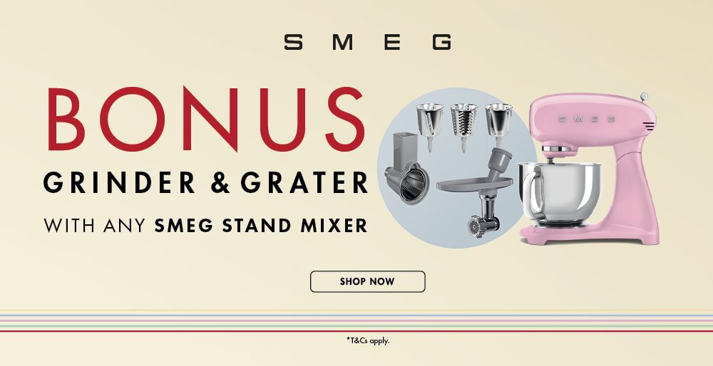 Purchase any Smeg stand mixer and receive a bonus grinder and grater attachment. Enjoy added versatility for effortless food prep. Offer available on eligible purchases.